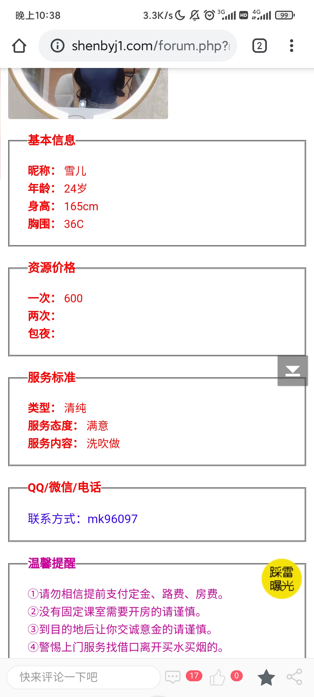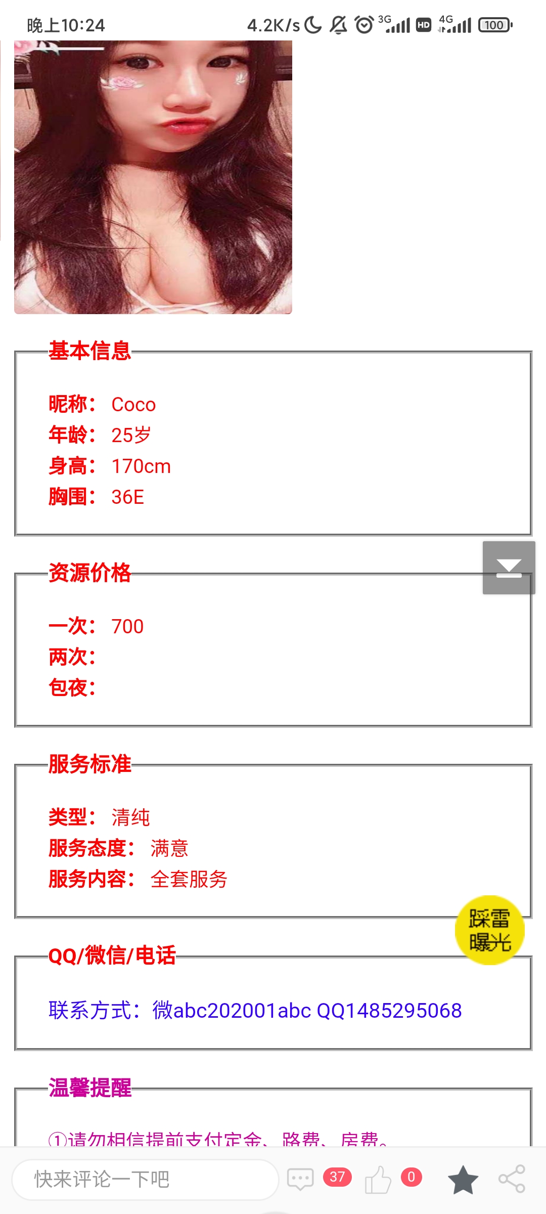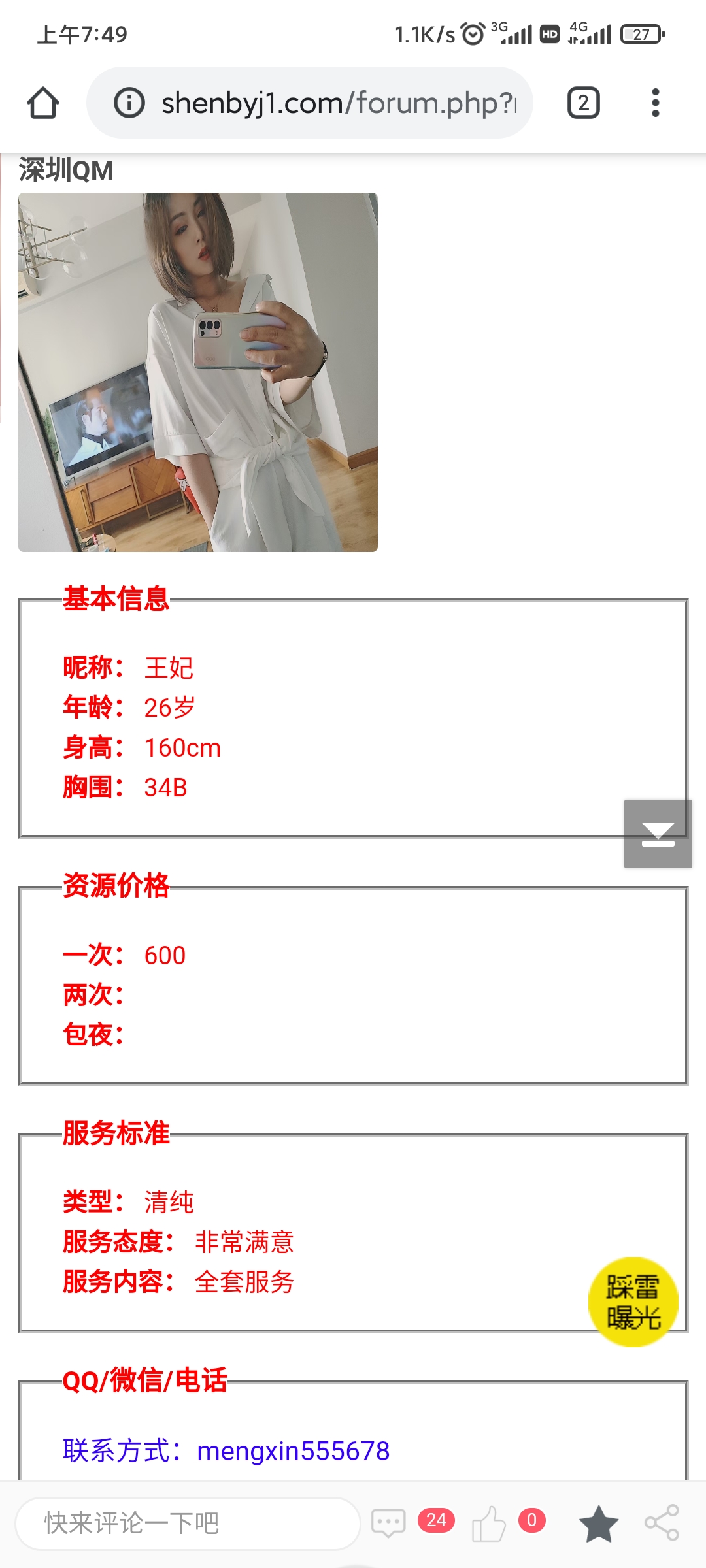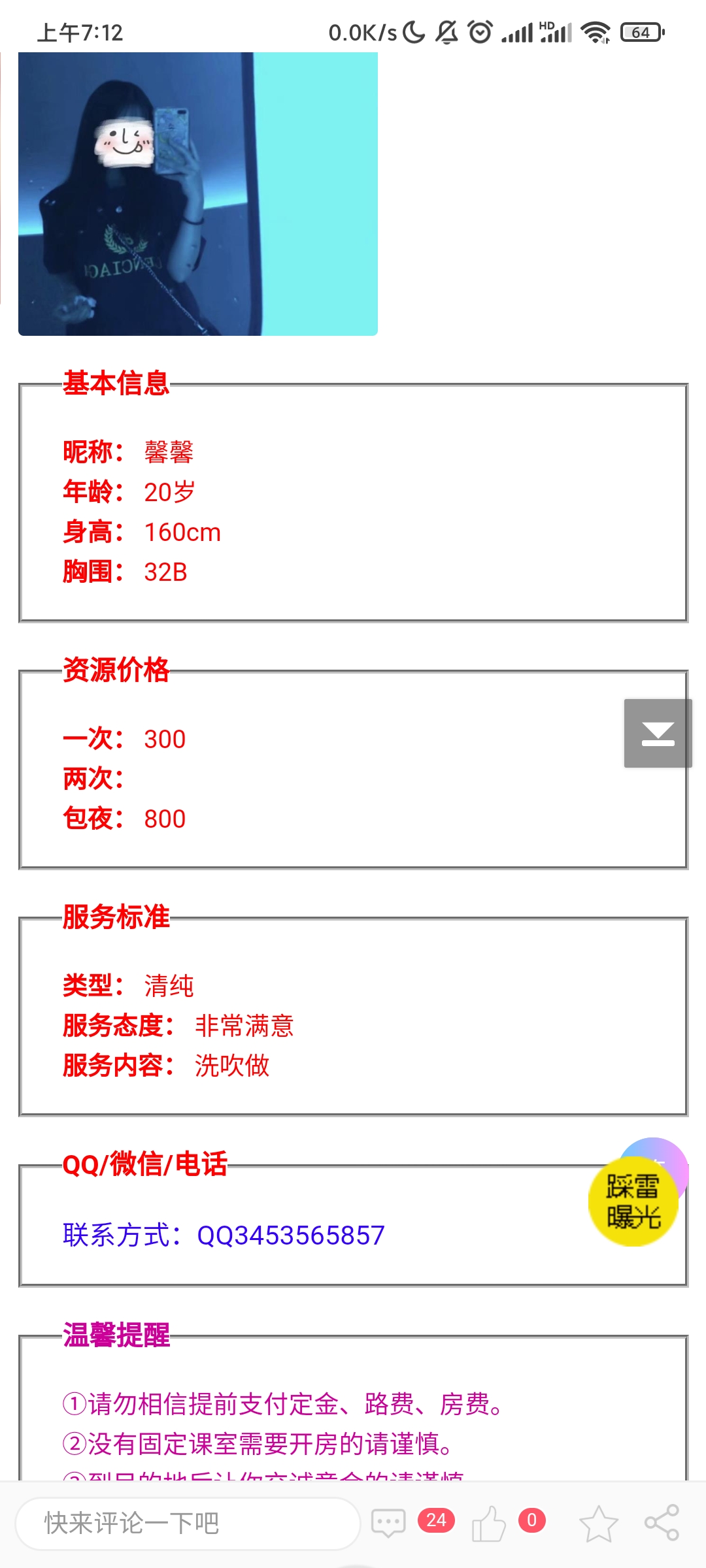 这就是个鸡头宣传假信息,长的一般还收700,加服务还要900,而宣传直说600。之前就举报过,现在又来了,还 ...