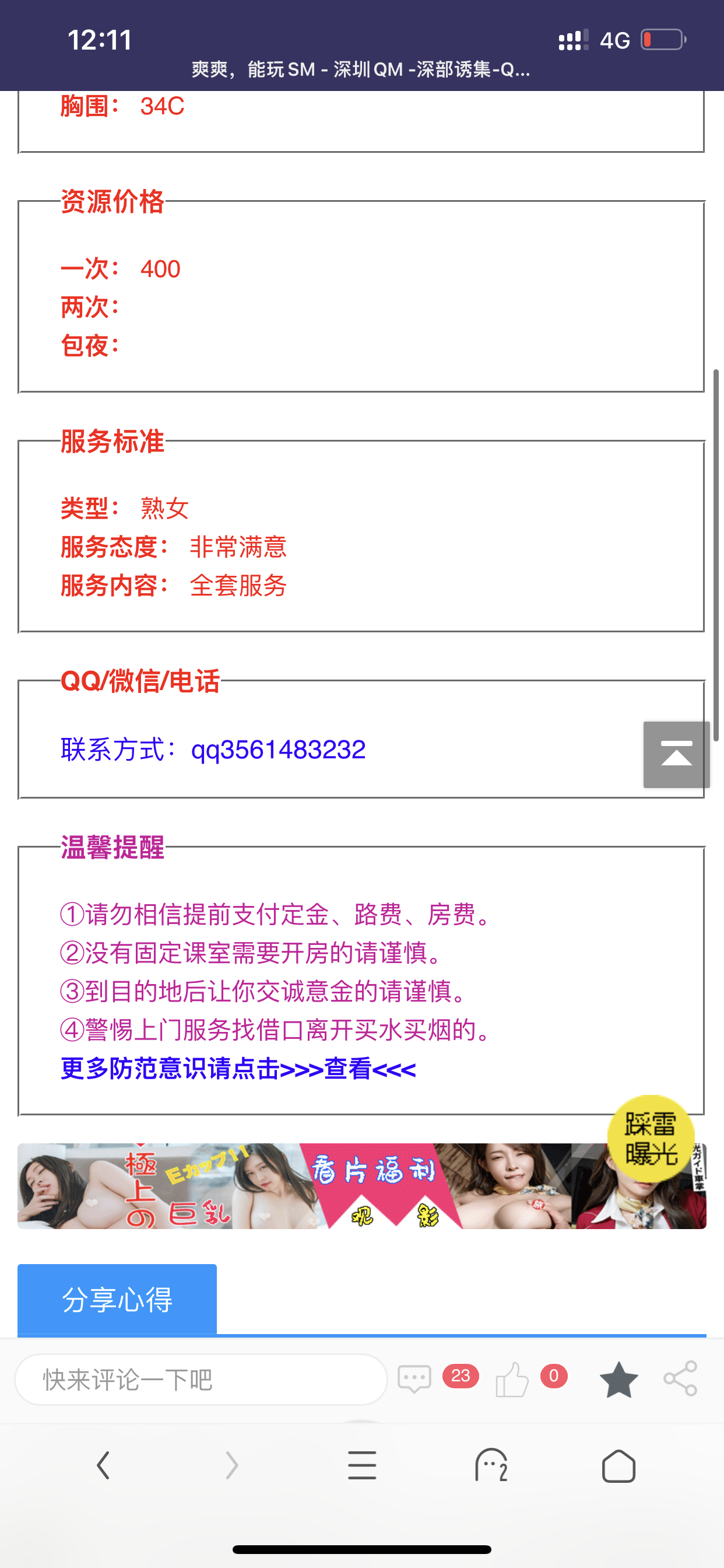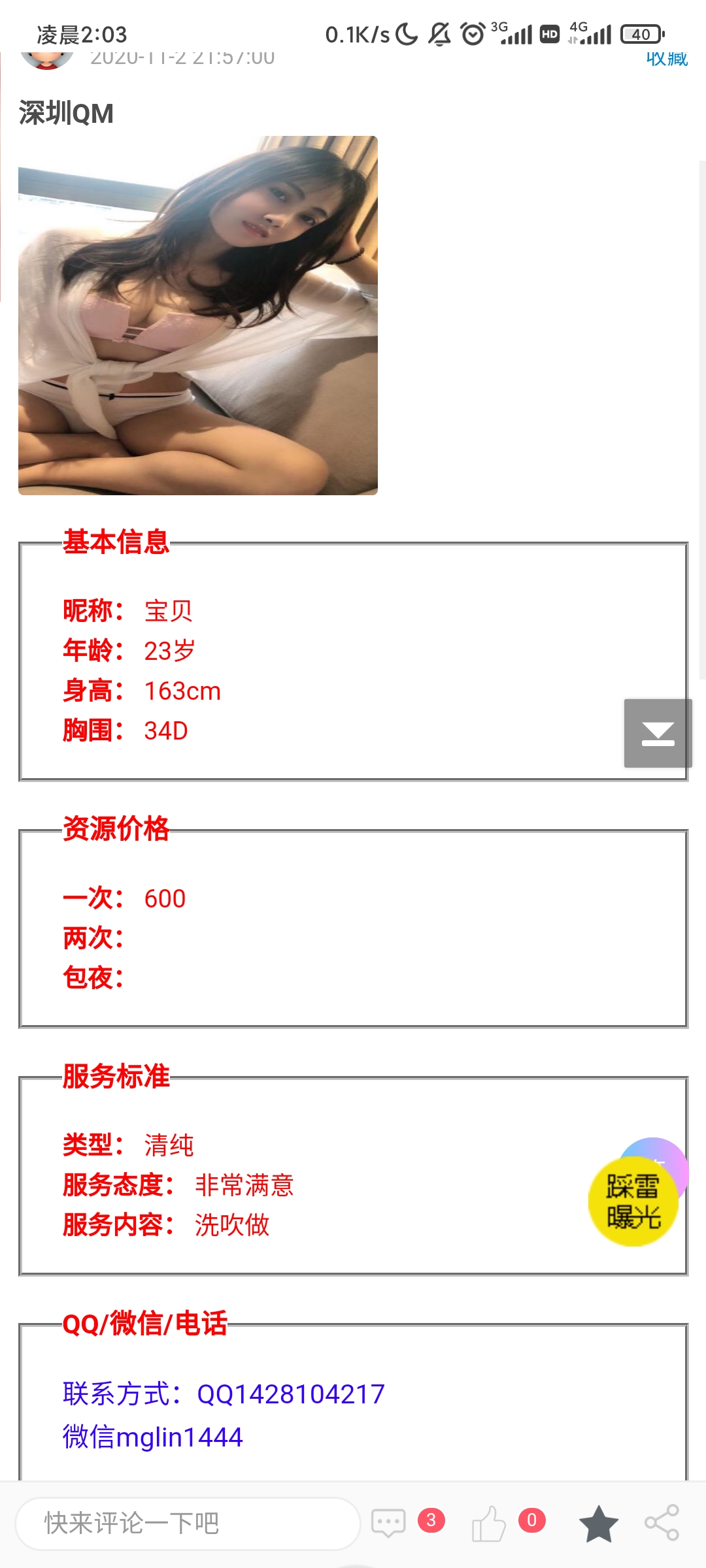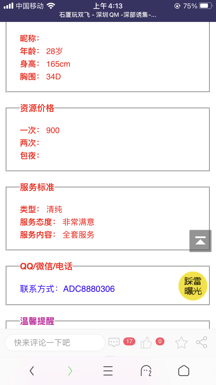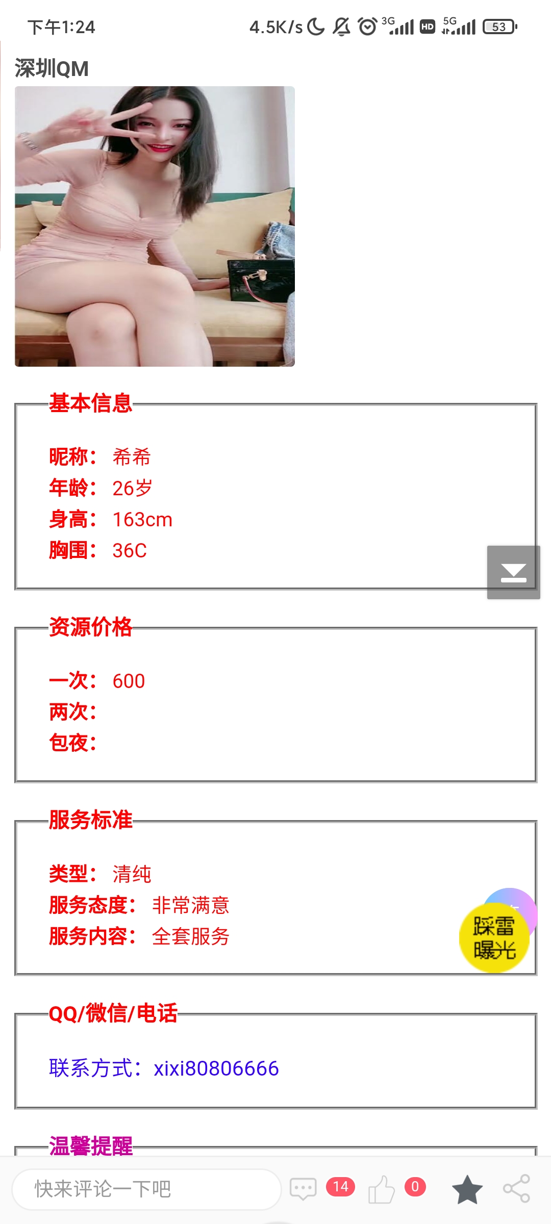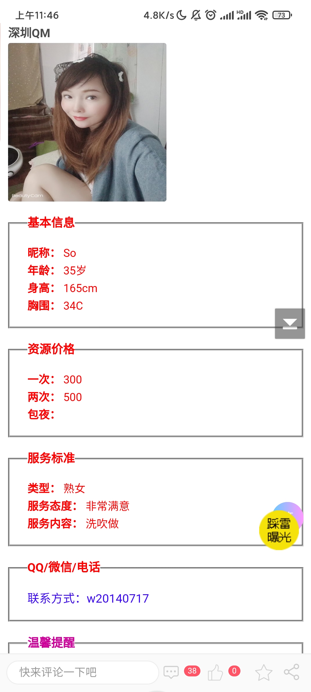 这就是个鸡头宣传假信息,长的一般还收700,加服务还要900,而宣传直说600。之前就举报过,现在又来了,还 ...